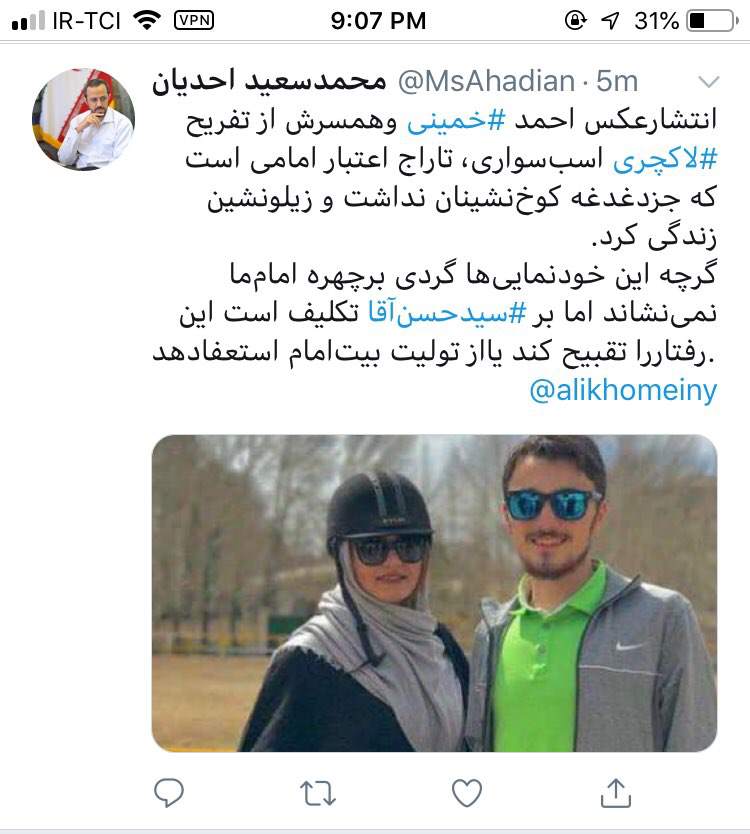 سید احمد خمینی فرزند سیدحسن خمینی، دربارهی انتشار عکسی در روزهای اخیر که با لباس اسب سواری در کنار خانمی جوان دیده میشود، ضمن اینکه گفته اسب ندارد و فقط تا به حال دو بار اسب سواری کرده، میگوید با خیلیها عکس دارد