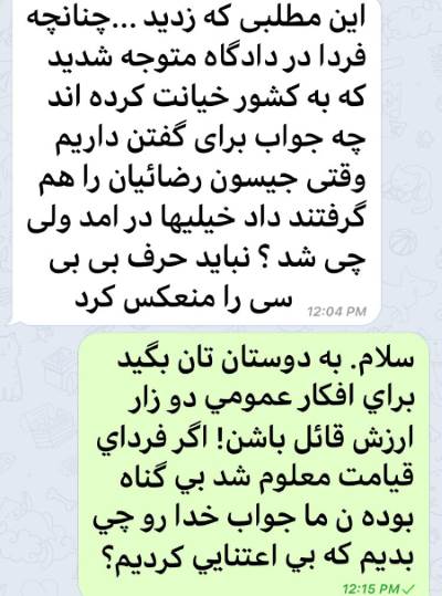 «مطلبی که در کانال تلگرام بازنشر کردم باعث اعتراض دوستی شد. این متن پرسش و پاسخ فیمابین ماست! #بدون_شرح #پرسش_و_پاسخ