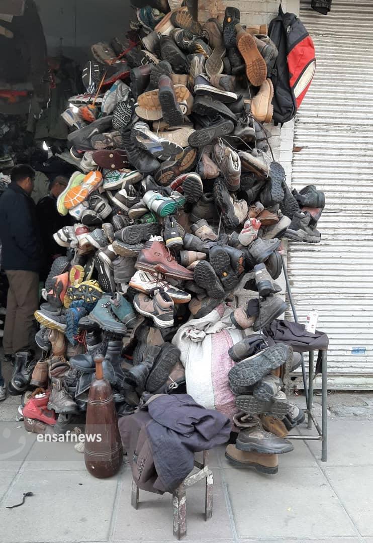 وارد مغازهای دو الی سه متری میشوم که به دیوار و سقف آن کفشهای کار کرده و کار نکرده آویزان است، فروشنده خریدارانش را هم قشر برندباز پولدار میداند و هم برنددوستان قشر متوسط که وسعشان به جنس نو نمیرسد، از تفاوت قیمتها میگوید: «معمولا تفاوت قیمت ما با قیمت اجناس نو یک پنجم است اما باز هم به تمیزی جنس بستگی دارد چون بعضی جنسها تمیزتر هستند.»
