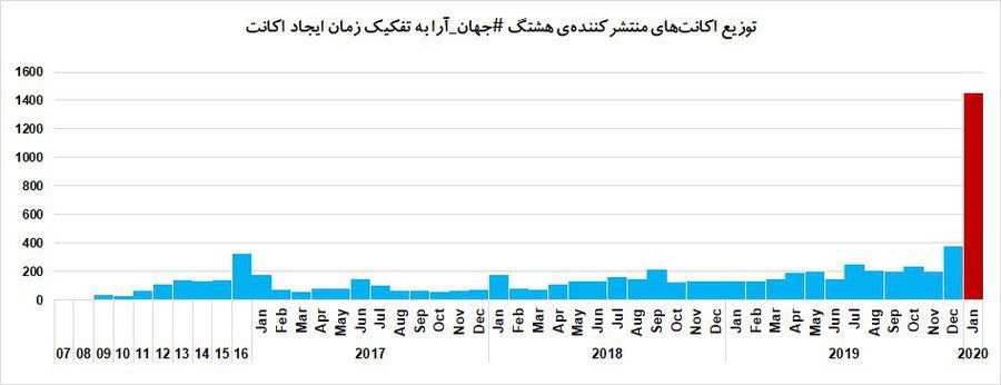 «#ممد_نبودی_ببینی که دروغ و تقلب چه بر سر مملکت آورده … هشتگ #جهان_آرا با همت ۱۴۵۴ اکانتی که در ۲۰ روز نخست ژانویه ۲۰۲۰ ایجاد شده بودند، هشتگ اول #توییتر_ایرانی شد. #آمارهای۶۳درصدی»