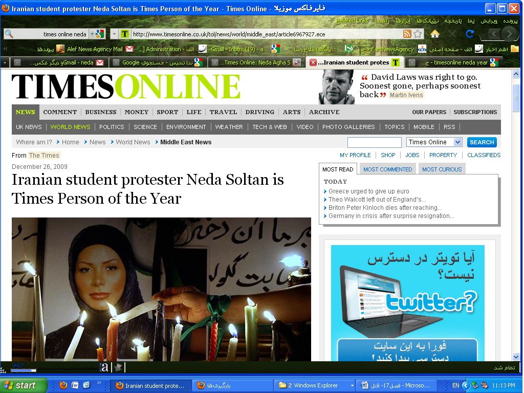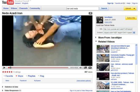 آ. تصویر ندا ساعتی بعد از رسانههای بینالمللی پخش نشد، حتی در اسکرین شات ضمیمه یوتیوب که ۲۱ژوئن۲۰۰۹(۲۴ساعت بعد) تصویر ۴۰۰بیننده دارد.