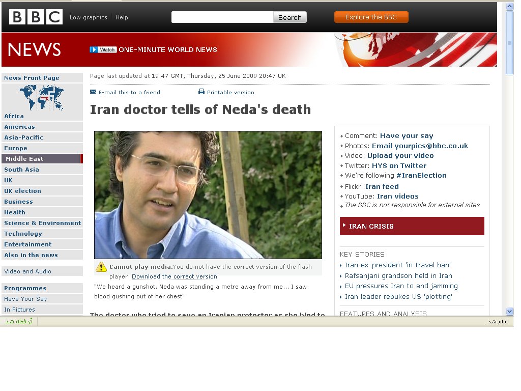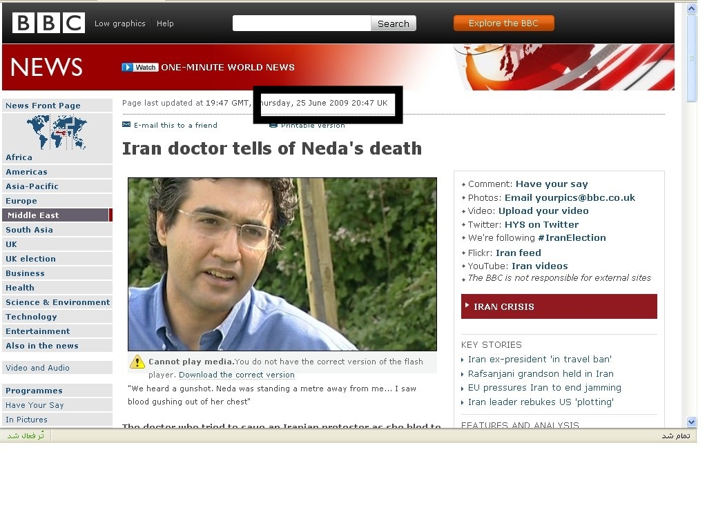 ب. آرش حجازی مترجم و پزشک ایرانی مقیم انگلیس ۴۸ ساعت بعد با BBC صحبت نکرده بلکه ۵ روز بعد ۲۵ ژوئن ۲۰۰۹ مصاحبه کرده است.
