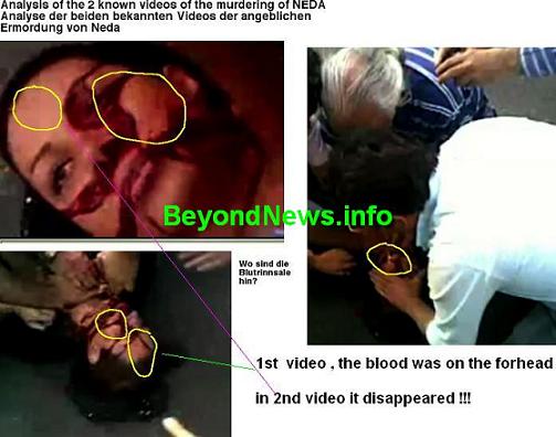 ازجمله رد خون روی پیشانی ندا که درفیلم اولیه موجود است ولی در عکس مشهور بعداز جان دادن ندا باچشمان باز، این ردخون وجود ندارد.