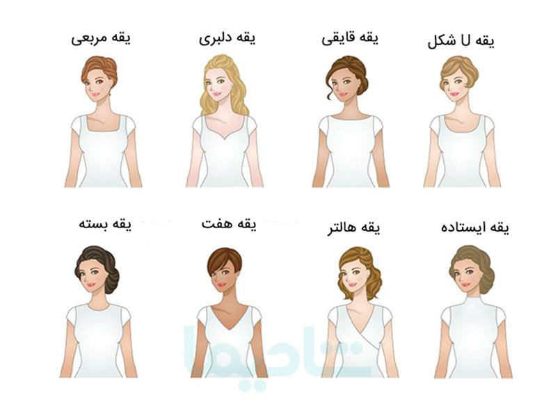 پس از انتخاب لباس حالا باید درباره نوع یقهی آن تصمیم گیری کنید. در تصویر زیر انواع یقه ها برای لباس عروس آورده شده است.