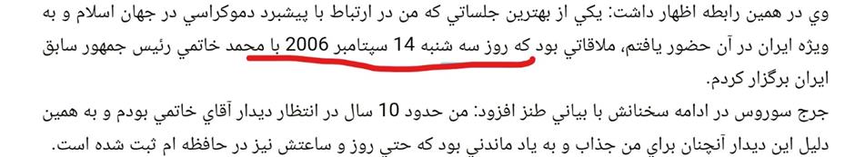اگر جرأت دارید، با مدیران کیهان تماس بگیرید تا سندهای متقن دیدار خاتمی با سوروس در سال ۲۰۰۶ میلادی را برایتان ارسال کنند. تا ببینم شهامت دارید بگویید کیهانیان ـ مثل همیشه ـ درست میگفتند و درغگو، محمد خاتمی و امثال او هستند؟