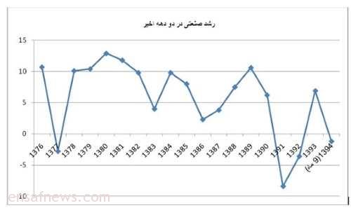 در سال ۱۳۹۱ صنعت و معدن ایران کاهش رشدی معادل با ۸.۴ درصد را شاهد بود. تداوم رشد منفی بخش صنعت و معدن در سال ۱۳۹۲ سبب کوچک شدن سهم این بخش از اقتصاد ایران شد و در این دو سال رشد اقتصادی ایران نیز منفی گزارش شده است . هر چند در سال ۱۳۹۳ رشد اقتصادی و به تبع آن رشد صنعتی ایران مثبت شد اما این وضعیت در سال ۱۳۹۴ دوام نیاورد و گزارش ارائه شده از سوی بانک مرکزی در خصوص رشد اقتصادی ۹ ماهه دلالت بر رشد منفی ۱.۲ درصدی بخش صنعت و معدن دارد . نمودار زیر وضعیت رشد بخش صنعت و معدن در دو دهه اخیر را نشان می دهد :