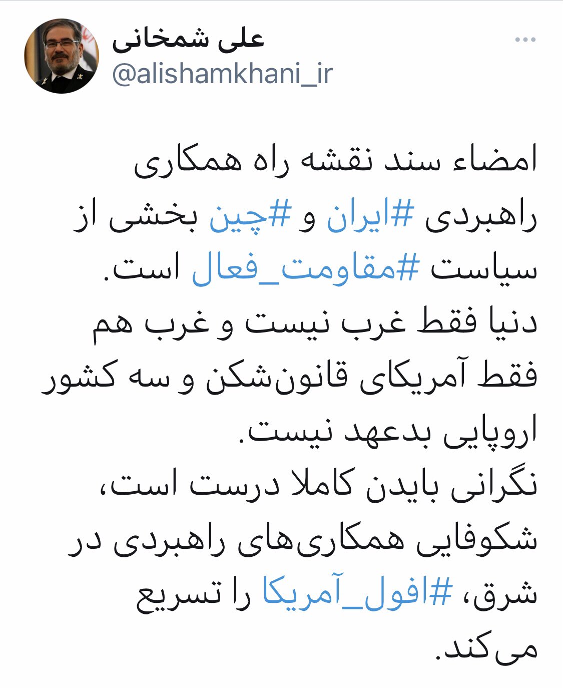 حمید ابوطالبی، مشاور سیاسی پیشین رئیسجمهور روحانی با اشاره به توییت دبیر شورایعالی امنیت ملی دربارهی سند همکاری راهبردی ایران و چین در صفحهی توییتر خود نوشت: