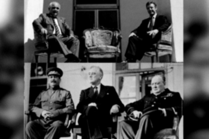 عکس ۲۰ مرداد ۱۴۰۰ دو دیپلمات ارشد به گونهای است که یادآور عکس تاریخی رهبرانشان در ۷۸ سال قبل – سال ۱۳۲۲ خورشیدی – با حضور ژوزف استالین، فرانکلین روزولت و وینستون چرچیل، رهبران اتحاد جماهیر شوروی، ایالات متحدۀ آمریکا و بریتانیا در جریان جنگ با آلمان هیتلری باشد و به همین خاطر صندلی وسط، خالی است چون آمریکا ۴۲ سال است در ایران سفیر ندارد اما همین صندلی خالی یعنی قصدشان بی هیچ شک و شبهه، شبیهسازی آن عکس تاریخی بوده و به آن میبالند.