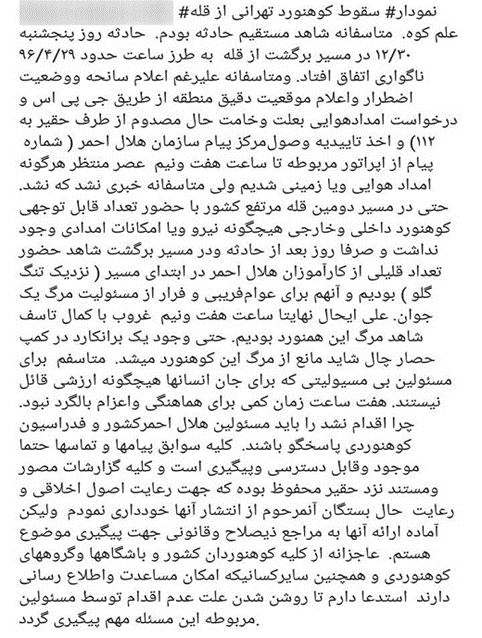 سخنگوی سازمان امدادونجات جمعیت هلالاحمر در اینباره گفت: «دو کوهنورد به نامهای حامد شاهحسینی و عباس کلهر قصد داشتند صعود زمستانی را در روز هفدهم دی ماه ثبت کنند. صعودی که بسیار سخت و تقریباً غیرممکن بود. برنامهای بسیار سنگین. از چند روز پیش به منطقه میرفتند و آنجا را ثابتگذاری میکردند و برمیگشتند. چهارشنبه دچار مشکل میشوند و ساعت ۱۱ با اورژانس مازندران تماس برقرار میکنند. اطلاع میدهند که آقای شاهحسینی دچار سرمازدگی شدید شدهاست و از ناحیه دست مشکل دارد. در یک طاقچه دیواره سنگی گیر کرده بود. به تیمهای امدادی مازندران خبر دادند و ما هم در جریان قرار گرفتیم. چهارشنبه ظهر با فدراسیون کوهنوردی هماهنگ کردیم تعدادی از نفرات فنی فدراسیون که کار دیوارهنوردی و کارهای فنی انجام میدهند، با ما همراه شوند تا بتوانیم این دو مرد را نجات دهیم. چهارشنبه ساعت ۳ به ما اطلاع دادند که قرار است امداد هوایی به منطقه برود اما به دلیل شدت بادی که در منطقه و تهران بود همچنین ابرناکی که در بعدازظهر چهارشنبه در منطقه وجود داشت، امکان امداد هوایی همچنین امداد زمینی نبود. چهار روز زمان میبرد تا بتوانند به منطقه برسند، احتمال ریزش بهمن هم وجود داشت. هماهنگیها انجام شد تا پنجشنبه صبح یک تیم متشکل از سه نجاتگر هلالاحمر استان تهران و سه نفر از فنیهای فدراسیون کوهنوردی با تجهیزات کامل وارد منطقه شوند. پیشبینی میشد اگر نجاتگران به منطقه برسند، دو یا سه روز باید در کوه بمانند، چون بارش برف و باران و برودت هوا مانع از حرکت تیم میشد.