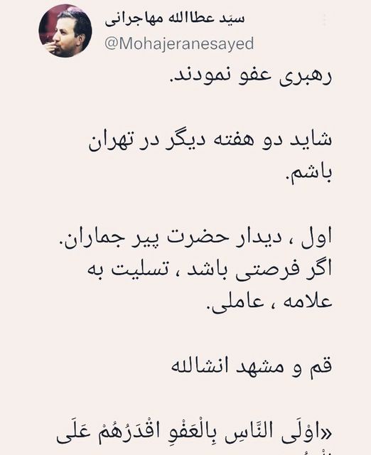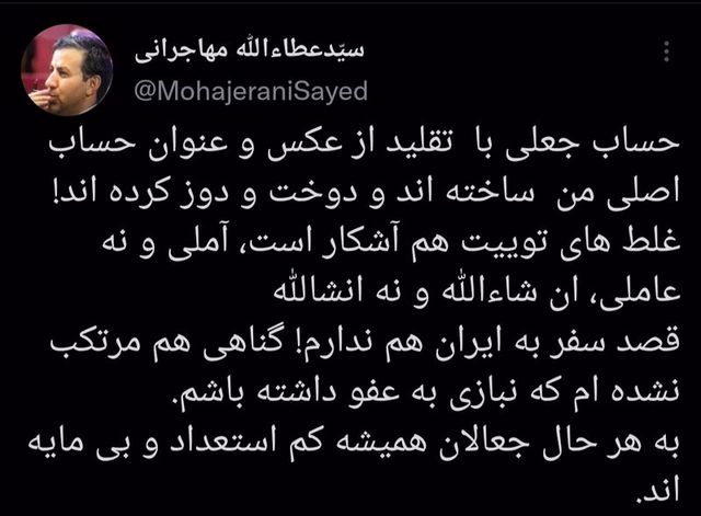 ساعاتی قبل یک اکانت توییتر با جعل نام و عکس عطاءالله مهاجرانی نوشته بود: «رهبری عفو نمودند. شاید دو هفته دیگر در تهران باشم».