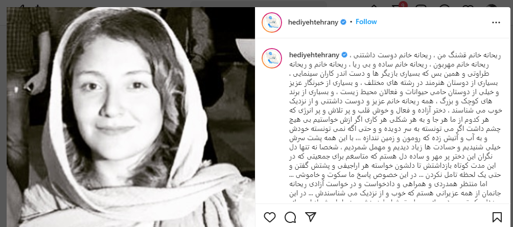 هدیه تهرانی در طی یادداشتی زیر پست خود نوشت: ریحانه خانم قشنگ من ، ریحانه خانم دوست داشتنی ، ریحانه خانم مهربون ، ریحانه خانم ساده و بی ریا ، ریحانه خانم و ریحانه طراوتی و همین بس که بسیاری بازیگر ها و دست اندر کاران سینمایی ، بسیاری از دوستان هنرمند در رشته های مختلف ، و بسیاری از خبرنگار عزیز و خیلی از دوستان حامی حیوانات و فعالان محیط زیست ، و بسباری از برند های کوچک و بزرگ ، همه ریحانه خانم عزیز و دوست داشتنی و از نزدیک خوب می شناسند ، دختر آزاده و فعال و خوش قلب و پر تلاش و پر انرژی که هر کدوم از ما هر جا و به هر شکلی هر کاری اگر ازش خواستیم بی هیچ چشم داشت اگر می تونسته به سر دویده و و حتی اگه نمی تونسته خودش و به آب و آتیش زده که رومون و زمین نندازه ،،، با این همه پشت سرش خیلی شنیدیم و حسادت ها زیاد دیدیم و مهمل شمردیم ، شخصا نه تنها دل نگران این دختر پر مهر و ساده دل هستم که متاسغم برای جمعیتی که در این مدت کوتاه بازداشتش تا دلشون خواسته هر اراجیفی و پشتش گفتن و حتی یک لحظه تامل نکردن … در این خصوص پاسخ ما سکوت و خاموشی … اما منتظر همدردی و همراهی و دادخواست و در خواست آزادی ریحانه جانمان از همه عزیرانی هستم که خوب و از نزدیک می شناسندش … در این روزها سکوت من هم برای مصلحت شرایط خودش بود ، اما بیش از این برای ریحانه و برای دیگر فعالین و مستند سازان عزیز و سایر آزادگان در بند سکوتمان جایز نیست …