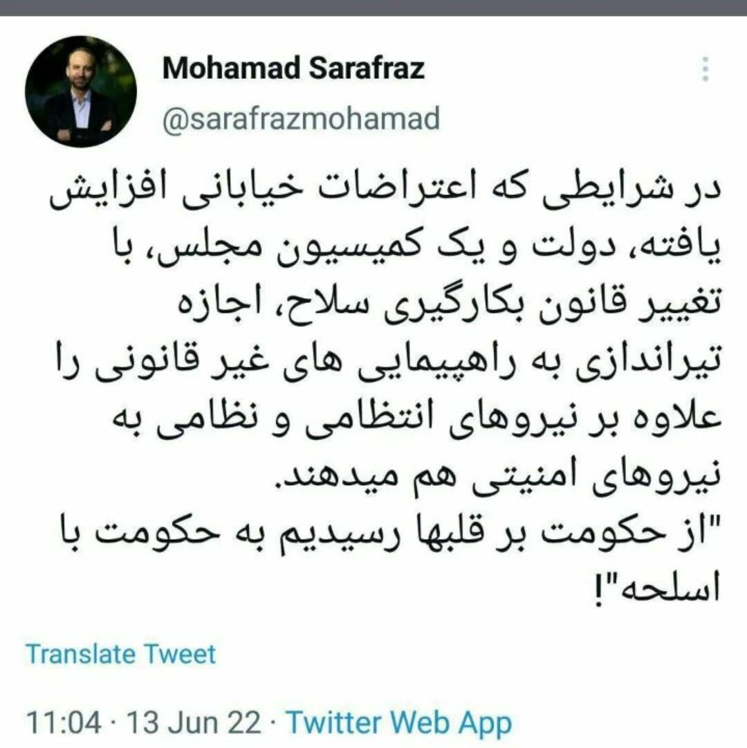 بفرمایید راهکار ضد انسانی و ضد دینی و ضد حقوق بشری تیر در مقابل حرف . رئیسی سفره هایمان را خالی کردی ، دیگر خونی نکن