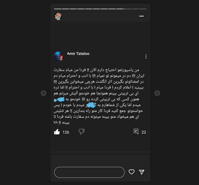 شب گذشته امیر تتلو استوری درباره گرفتن پاسپورت گذاشت و امروز ویدیوهایی از طرفداران او ملقب به تتلیتی ها منتشر شده است که او در حال رفتن به سفارت ایران در ترکیه است.