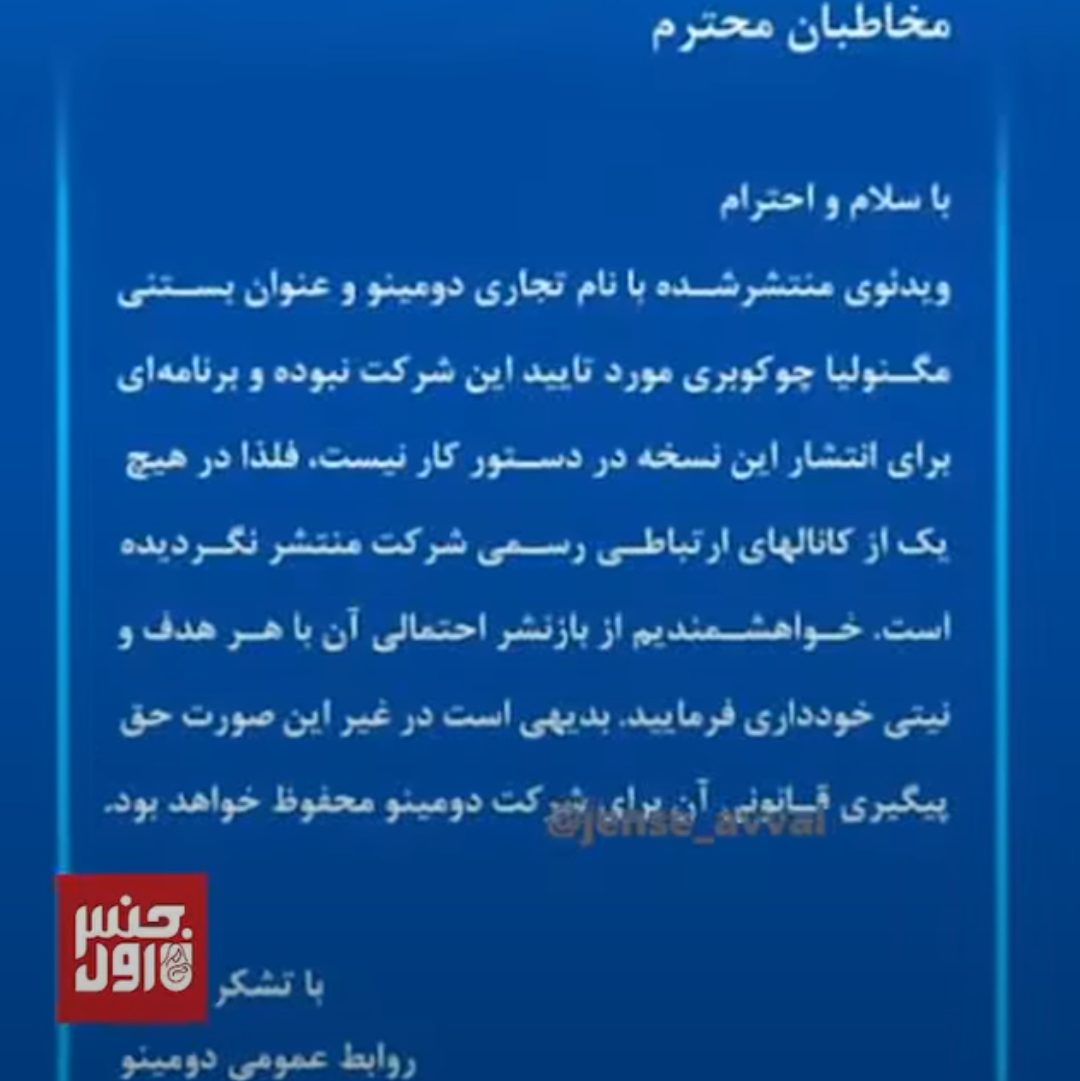 فیلم | تبلیغ منتشر شده در توییتر و اینستاگرام دومینو + بیانیه غیررسمی درباره دیگر تبلیغات