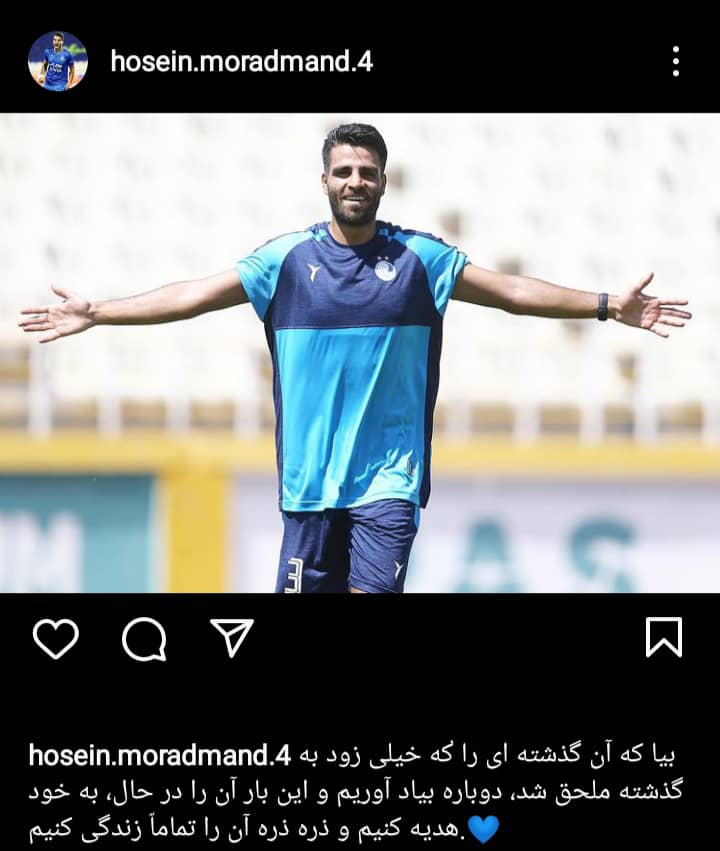 «محندحسین مرادمند که با مساعدت نیروی دریایی ارتش جمهوری اسلامی ایران و باشگاه ملوان مجوز تمرین با استقلال را به دست آورده، از امروز تمرینات خود را به صورت اختصاصی و زیر نظر بدنساز تیم آغاز کرد تا با پایان دوران خدمت مقدس سربازی، به صورت رسمی به جمع آبیپوشان بازگردد.»