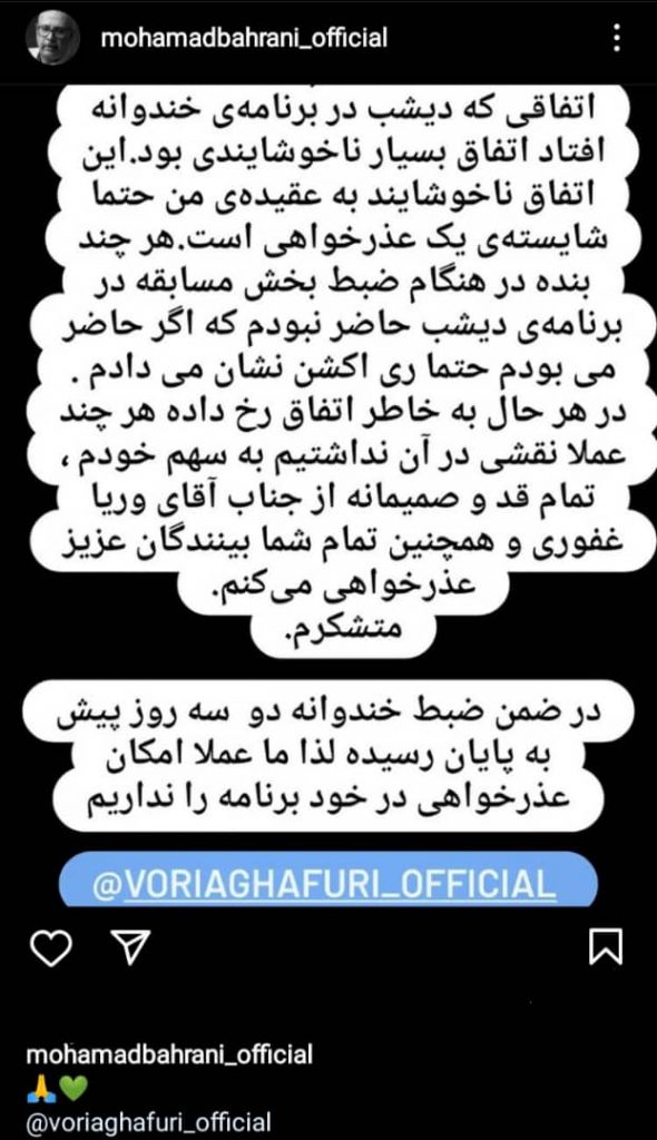 «اتفاقی که دیشب در برنامه خندوانه افتاد اتفاق بسیار ناخوشایندی بود. این اتفاق ناخوشایند به عقیده من حتما شایستهی یک عذرخواهی است. هرچند بنده در هنگام ضبط بخش مسابقه در برنامهی دیشب حاضر نبودم که اگر حاضر میبودم حتما ریاکشن نشان میدادم. در هرحال به خاطر اتفاق رخ داده هرچند عملا نقشی در آن نداشتیم به سهم خودم، تمام قد و صمیمانه از جناب آقای وریا غفوری و همچنین تمام شما بینندگان عزیز عذرخواهی میکنم. متشکرم