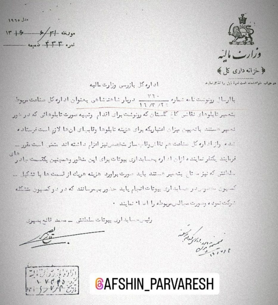 با ارسال رونوشت نامه شماره ۱۶ /۳ /۲۹ -۷۶۰ دربار شاهنشاهی بعنوان اداره کل صناعت مربوط به “تعمیر تابلوهای نقاشی کاخ گلستان” که رونوشت برای اقدام و تهیه صورت تابلوهایی که در خور تعمیر هستند با تعیین میزان اعتباری که برای هزینه تابلوها وقابهای آنها لازم است فرستاده شده و از اداره کل صناعت هم نقاش و قاب ساز متخصص نیز اعزام داشته اند متمنی است مقرر فرمایند یکنفر نماینده از آن اداره به حسابداری بیوتات برای این منظور و همچنین یک قسمت چادرهای سلطنتی که نیز محتاج به تعمیر هستند باید صورت برآورد هزینه هریک از قسمت ها با تشکیل کمیسیون مخصوص در حسابداری بیوتات انجام یابد حضور بهم رسانند که در دو کمسیون متشکله شرکت نموده و صورت مجالس مربوطه را امضاء نمایند.