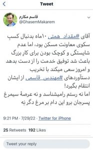 این توئیت آقای مکارم علیه مقداد همتی بر وجود رقابتهای پنهانی در وزارت راه وشهرسازی صحه گذاشت