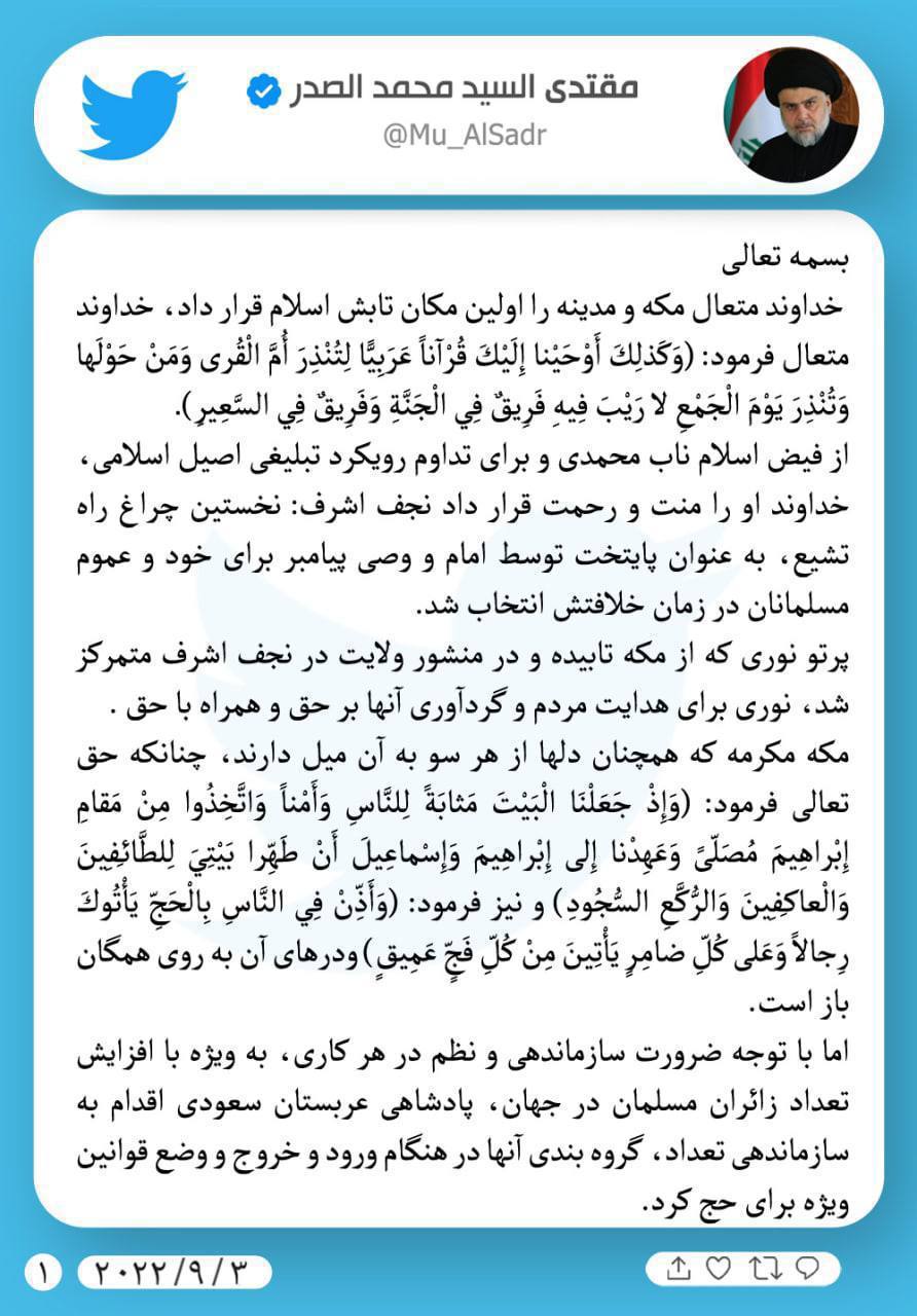 مقتدی صدر: زائران ایرانی عادات و رسوم میزبان را رعایت کنند [+متن کامل بیانیه]