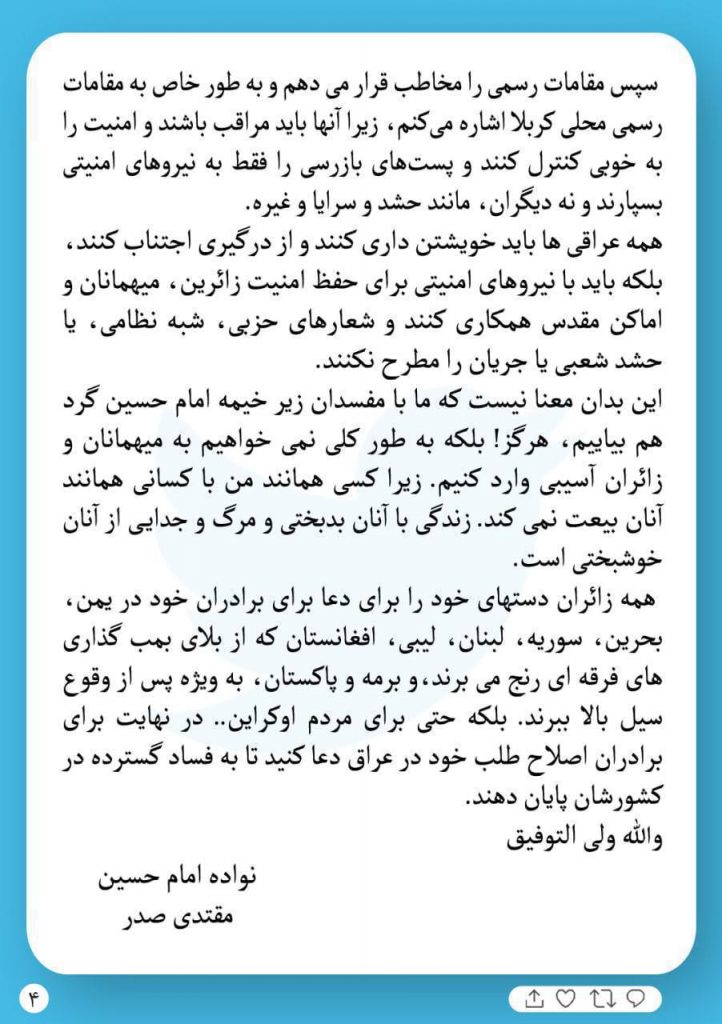 شفقنا نوشت: «سید مقتدی صدر در متنی که به زبان فارسی و با امضای «نواده ی امام حسین» منتشر کرده نکاتی را درباره زیارت اربعین به زائران ایرانی یادآور شده است.