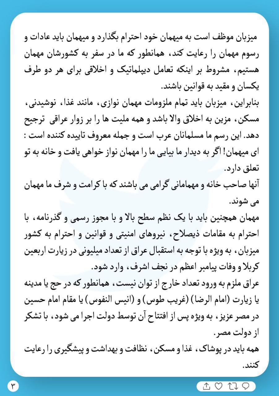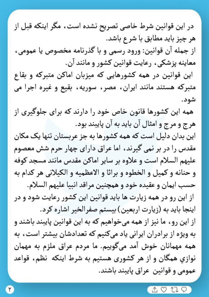 در این متن آمده است: در همه زیارت ها باید قوانین این کشور رعایت شود. ما از همه به ویژه زائران ایرانی که تعدادشان بیشتر است، می خواهیم به این قوانین پایبند باشند. ما مردم عراق ملزم به مهمان نوازی همگان و از هر کشوری هستیم. میزبان موظف است به میهمان خود احترام بگذارد. میهمان نیز باید عادات و رسوم میزبان را رعایت کند»