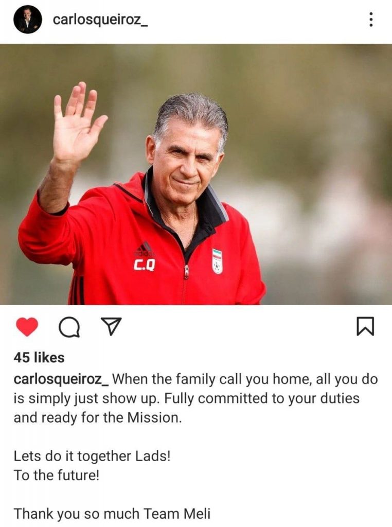 ایران خانواده من است؛ این اولین واکنش کیروش پس از بازگشت به تیم ملی ایران در صفحه اینستاگرامی اش است. مرد پرتغالی به زودی وارد ایران خواهد شد.