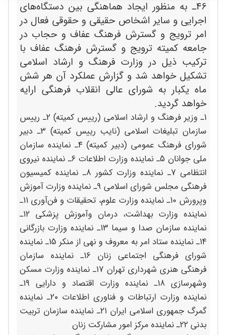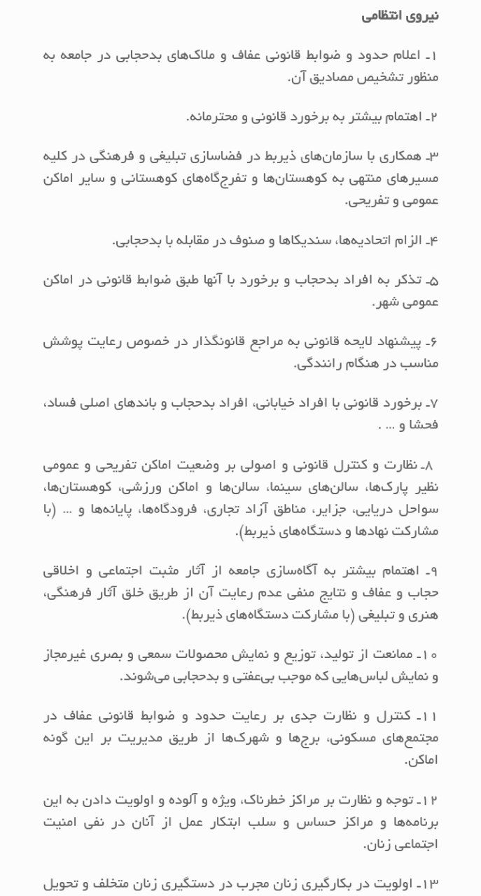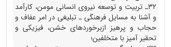۳۲ ـ تربیت و توسعه‌ی نیروی انسانی مؤمن، کارآمد و آشنا به مسائل فرهنگی-تبلیغی در امر عفاف و حجاب و پرهیز از برخوردهای خشن، فیزیکی و تحقیرآمیز با متخلّفین؛»