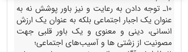 «۱۰- توجّه دادن به رعایت و نیز باور پوشش نه به عنوان یک اجبار اجتماعی بلکه به عنوان یک ارزش انسانی، دینی و معنوی و یک باور قلبی جهت مصونیت از زشتی‌ها و آسیب‌های اجتماعی؛