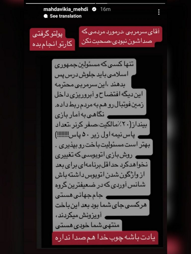 مهدویکیا در استوری ساعاتی پیش خود نوشت:
