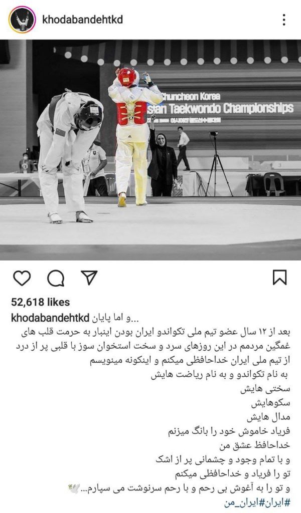 «بعد از ۱۲ سال عضو تیم ملی تکواندو بودن اینبار به حرمت قلبهای غمگین مردمم در این روزهای سرد و سخت استخوانسوز با قلبی پر از درد از تیم ملی ایران خداحافظی میکنم و اینگونه مینویسم به نام تکواندو و به نام ریاضتهایش، سختیهایش، سکوهایش، مدالهایش، فریاد خاموش خود را بانگ میزنم خداحافظ عشق من و با تمام وجود و چشمانی پر از اشک تو را فریاد و خداحافظی میکنم و تو را به آغوش بیرحم و با رحم سرنوشت میسپارم.»