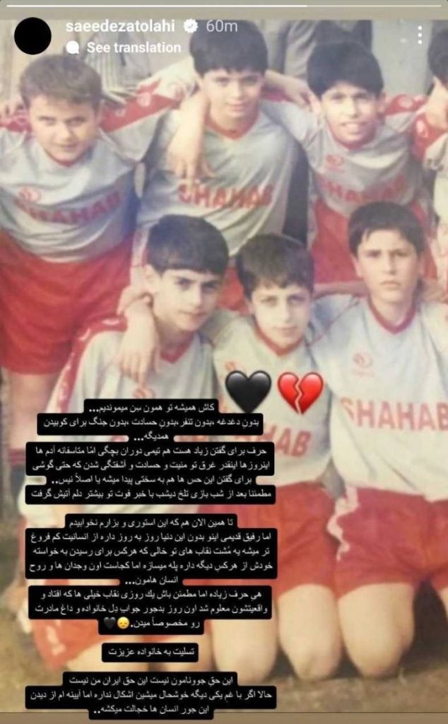 «کاش همیشه تو همون سن میموندیم، بدون دغدغه، بدون نفرت، بدون حسادت، بدون جنگ برای کوبیدن همدیگه. حرف برای گفتن زیادی است همتیمی دوران بچگی اما متاسفانه آدمها این روزها غرق در منیت و حسادت و آشفتگی شدن که حتی گوشی برای گفتن این حسها به سختی پیدا میشه یا اصلا نیست. مطمئنا بعد از بازی تلخ دیشب با خبر فوت تو بیشتر دلم آتش گرفت.
