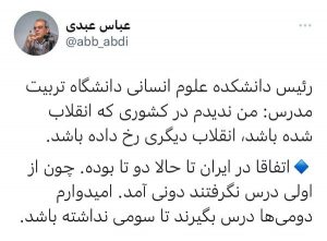 ظاهرا رئیس دانشکده علوم انسانی دانشگاه تربیت مدرس در جایی گفته است: «من ندیدم در کشوری که انقلاب شده باشد، انقلاب دیگری رخ داده باشد.» این اظهار نظر به هیچ عنوان دقیق نیست. مردم فرانسه در سه سده گذشته چندین بار دست به انقلاب زدهاند. تاریخ اروپای غربی انقلابات متعددی را به خود دیده است. حتی تاریخ روسیه و چین نیز شاهد چندین کنش و واکنش انقلابی بوده است. اما موضوع این یادداشت، توئیت عباس عبدی درباره این اظهار نظر است که خطاب به رئیس دانشکده علوم انسانی دانشگاه تربیت مدرس نوشته است: «اتفاقا در ایران تا به حال دو تا بوده. چون از اولی درس نگرفتند، دومی آمد. امیدوارم دومیها درس بگیرند تا سومی نداشته باشد.»