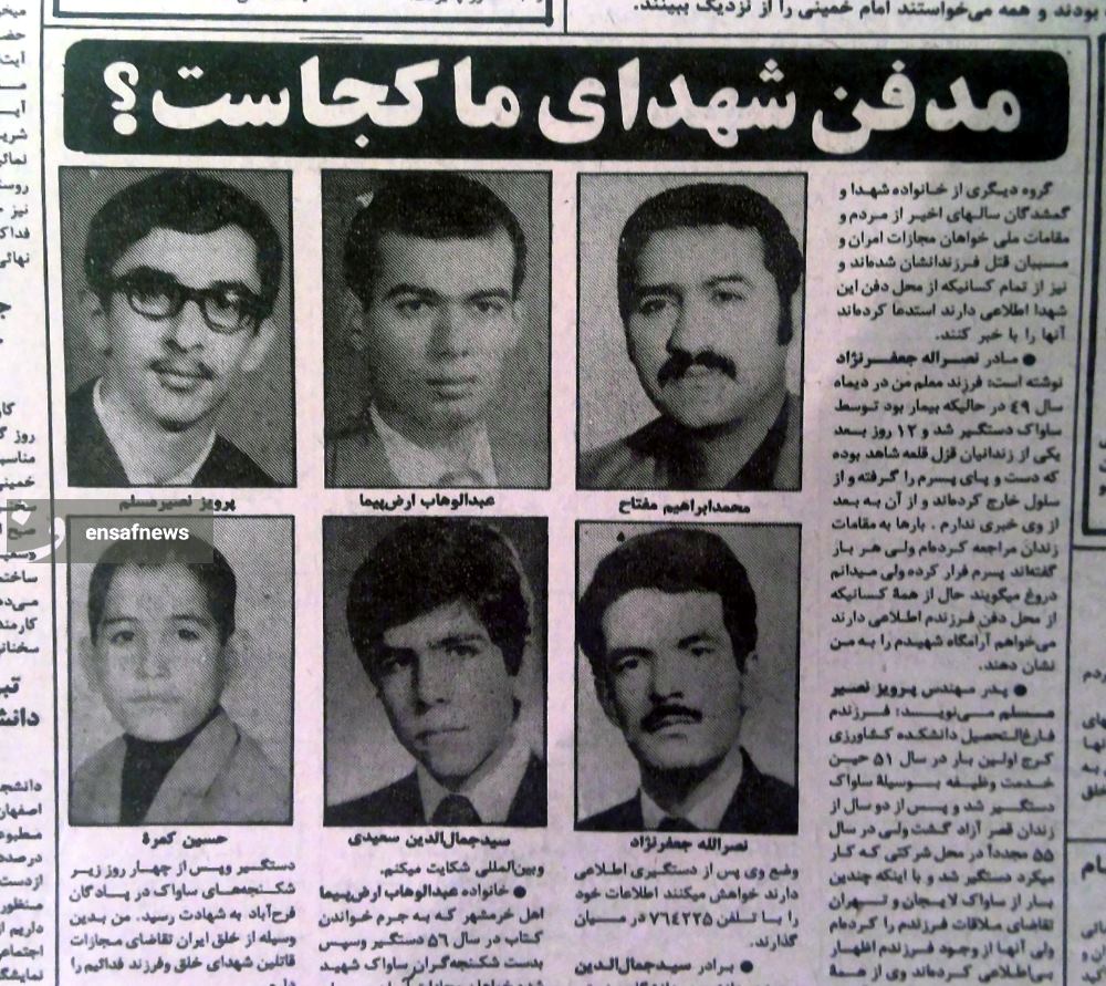 روزنامه کیهان در گزارشی با عنوان «مدفن شهدای ما کجاست» تصویری از ۶ نفر را منتشر کرده بود که خانوادههایشان مدعی شده بودند توسط ساواک دستگیر و شکنجه شدهاند، به قتل رسیدهاند و بی خبر از خانوادهها به خاک سپرده شدهاند.