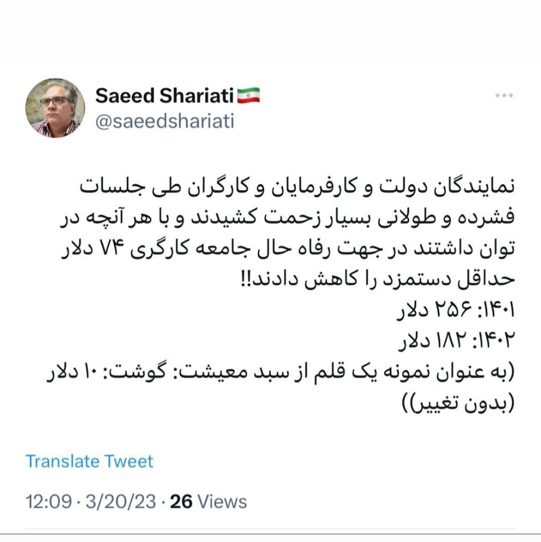 سعید شریعتی در توییتر خود نوشت: نمایندگان دولت و کارفرمایان و کارگران طی جلسات فشرده و طولانی بسیار زحمت کشیدند و با هر آنچه توان داشتند در جهت رفاه حال جامعه کارگری ۷۴ دلار حداقل دستمزد را کاهش دادند!!