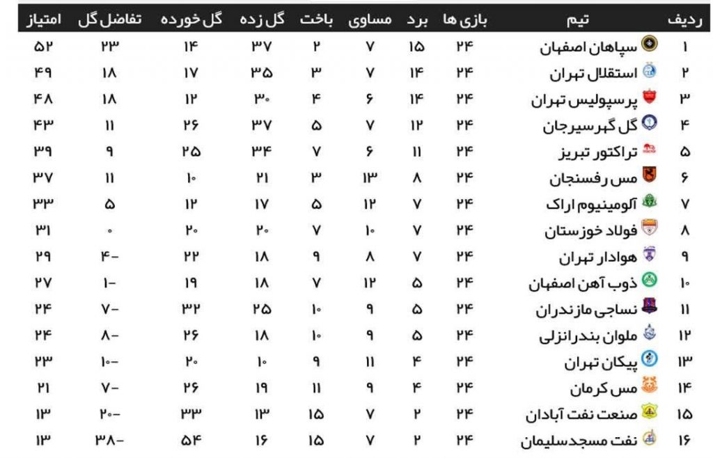 بدین ترتیب ۳ تیم سپاهان اصفهان، استقلال تهران و پرسپولیس تهران در پایان هفته ۲۴ام به ترتیب با ۵۲، ۴۹ و ۴۸ امتیاز در جایگاههای اول تا سوم قرار گرفتند؛ حالا نگاهی خواهیم داشت بر نتایج کامل هفته بیست و چهارم لیگ برتر ایران