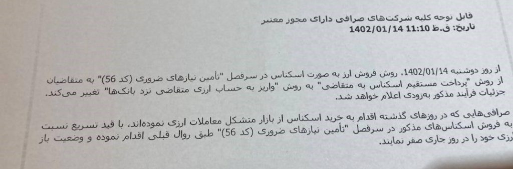 بر اساس تصویری که از بخشنامه جدید بانک مرکزی به صرافیها منتشر شده است، تهیهکنندگان این بخشنامه وعده دادهاند جزییات تصمیم جدید را متعاقبا اعلام کنند اما آنچه قطعی شده؛ این است که صرافیها حق ندارند به متقاضیان اسکناس تحویل دهند.