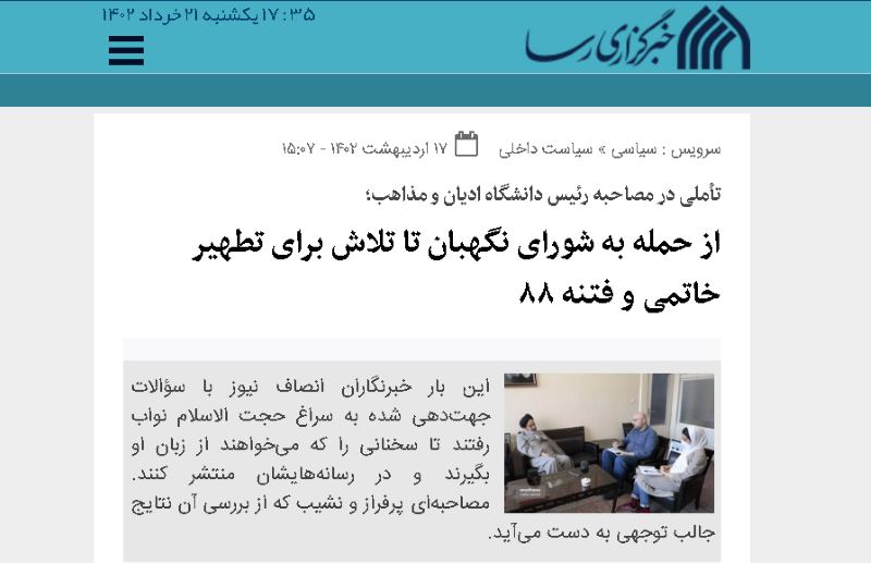 «وقتی رسانههای اصلاحات ضرب شصت محکم شورای نگهبان در انتخابات ۱۴۰۰ را دیدند، در انتخابات ۱۴۰۲ مجلس شورای اسلامی، شمشیر از رو بستهاند و با تخطئه شورای نگهبان، میکوشند درحالی که هنوز تاب و تب انتخابات مجلس شروع نشده است، شورای نگهبان را زیر فشار رسانهای و بمباران خبری قرار بدهند تا تأیید صلاحیت اشخاص تحت الشعاع قرار بگیرد. انصاف نیوز یکی از این رسانهها بود که در کنار جماران، این بار به سراغ حجتالاسلام سیدابوالحسن نواب، رئیس دانشگاه ادیان و مذاهب رفت تا از این طریق اتهاماتی به نظام وارد سازد.