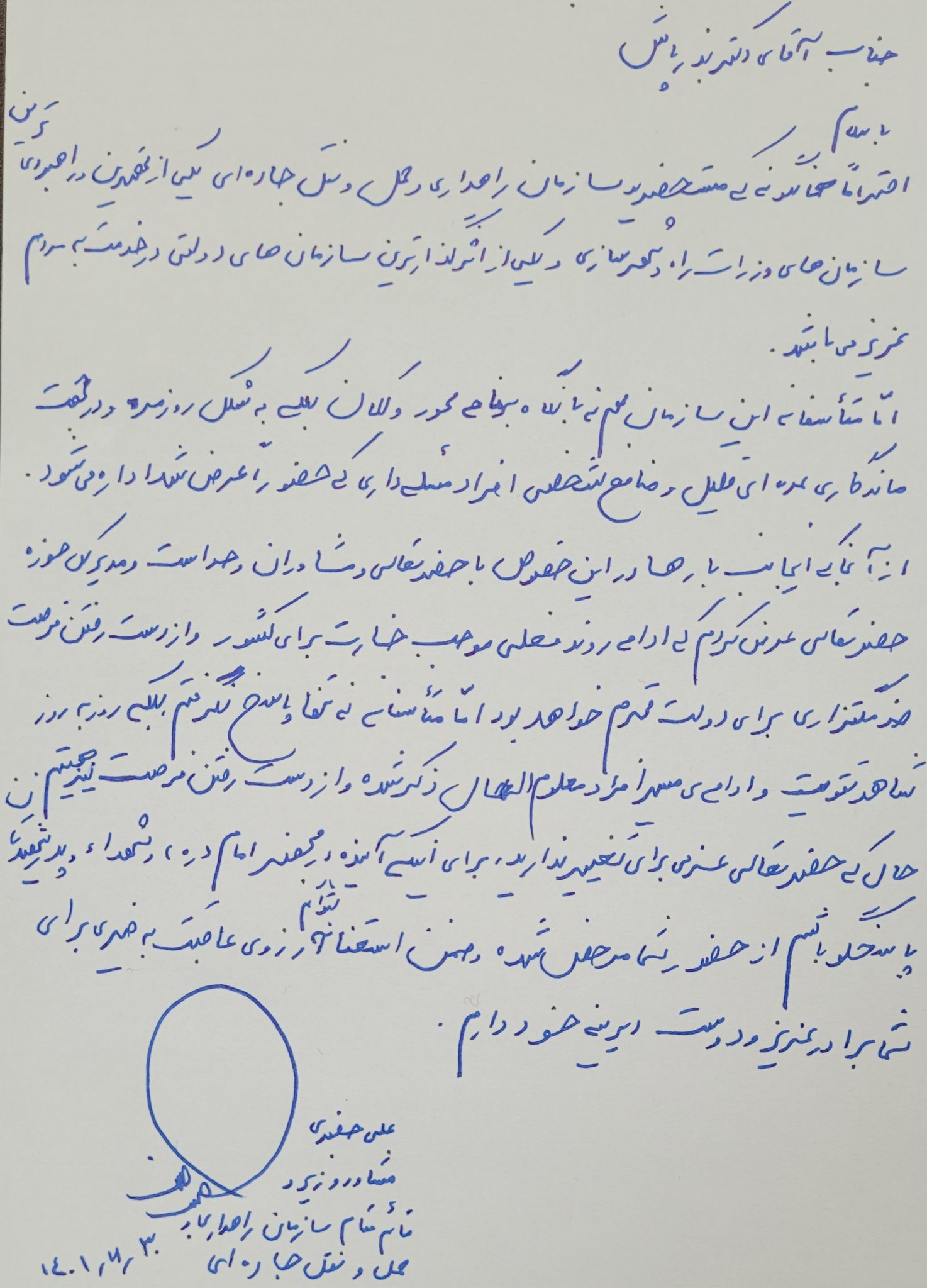 جناب جعفری بزرگوار از خداوند برای شما آرزوی سلامتی و تندرستی داریم. ما کارمندان با سابقه کار بالا دلیل این تصمیم عاقلانه شما را میفهمیم و از شجاعت و عزم راسخ شما در این رابطه سپاسگزاریم