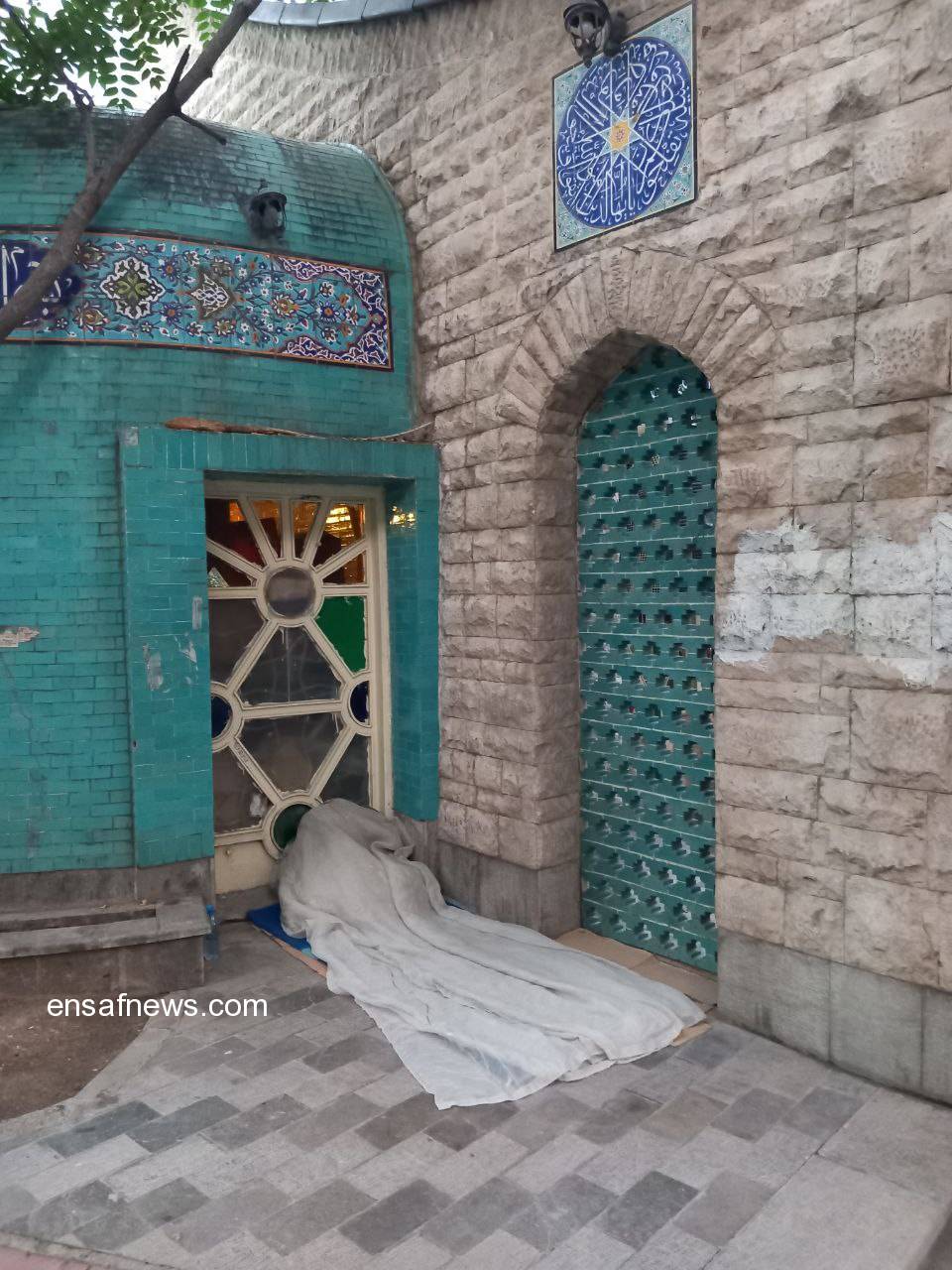 مسجد میانه ی پارک با پرچمهای محرم تزئین شده بود. پشت مسجد رختخواب مختصر یا محل زندگی شخصی با ملحفه از چشمها پوشیده شده بود.