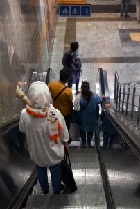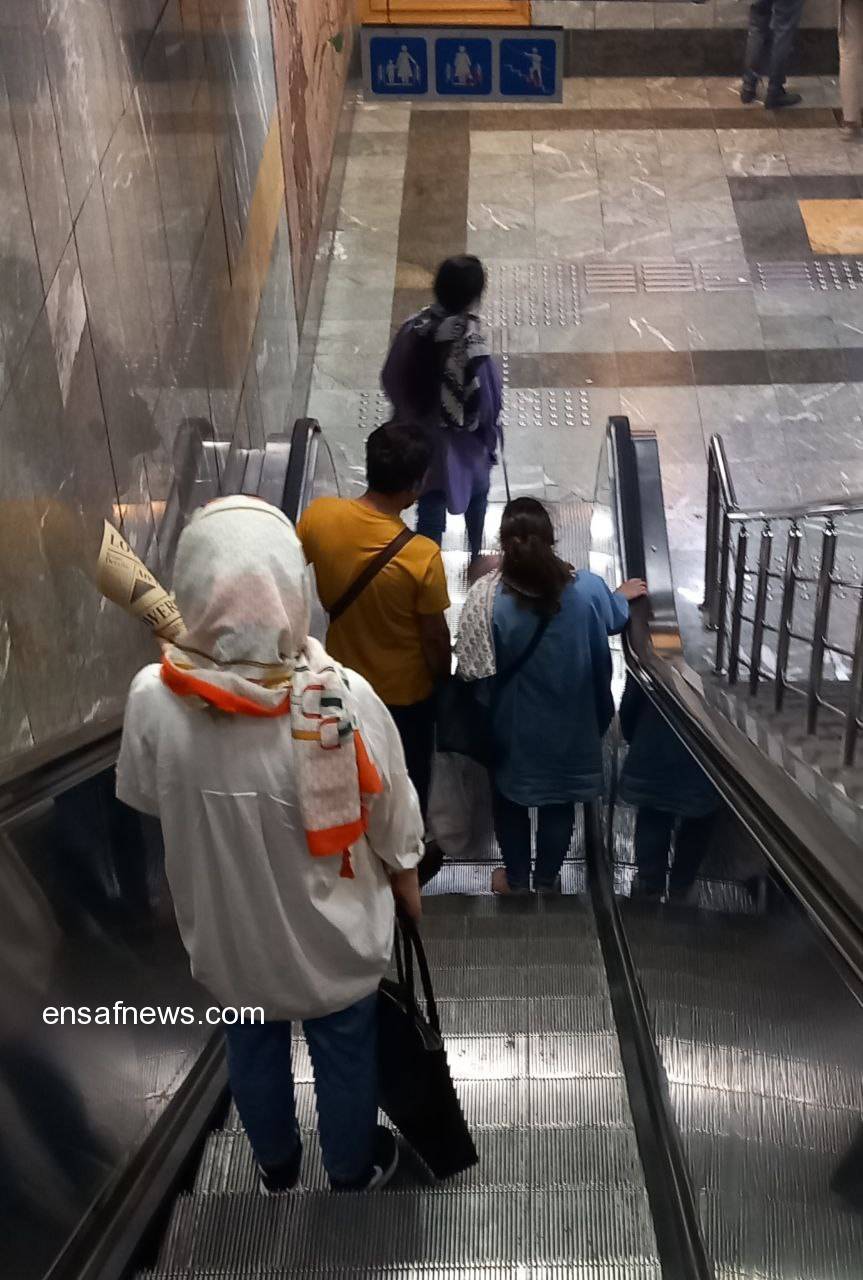 بعد از خیابان ولیعصر به سمت شمال روبروی ورودی مترو، دو مامور خانم جوان همراه چند مامور ایستاده بودند که میانشان مرد مسنتر هم بود و به نظر میآمد از درجات نظامی بالاتری باشد. خانمها به دختری که از مترو بیرون میآمد با صدای بلند تذکر دادند: خااانممم خااانممم با تواَم! دختر خودش را به نشنیدن زد و عبور کرد. پیرمردی که چند قدم آنطرفتر نظارهگر این صحنه بود غرولند میکرد: جرئت نداره صورتشو نشون بده! منظور پیرمرد ماسکی بود که روی صورت تمام این ماموران زن دیده میشود.