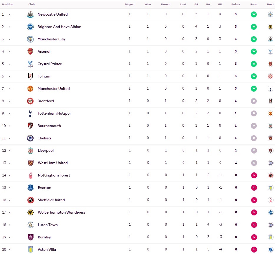 جدول پریمیرلیگ در پایان هفته اول فصل 2024_2023