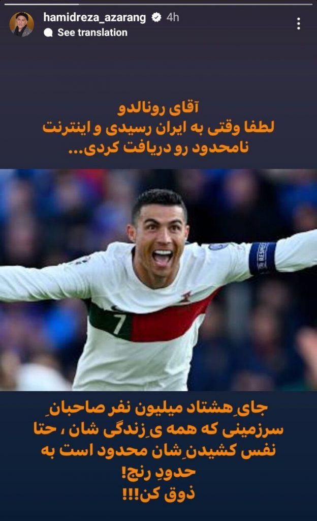 پیام خاص حمیدرضا آذرنگ به کریستیانو رونالدو : به جای ما با اینترنت آزاد ذوق کن؛ اینجا نفس کشیدن هم محدود است به حدود رنج!