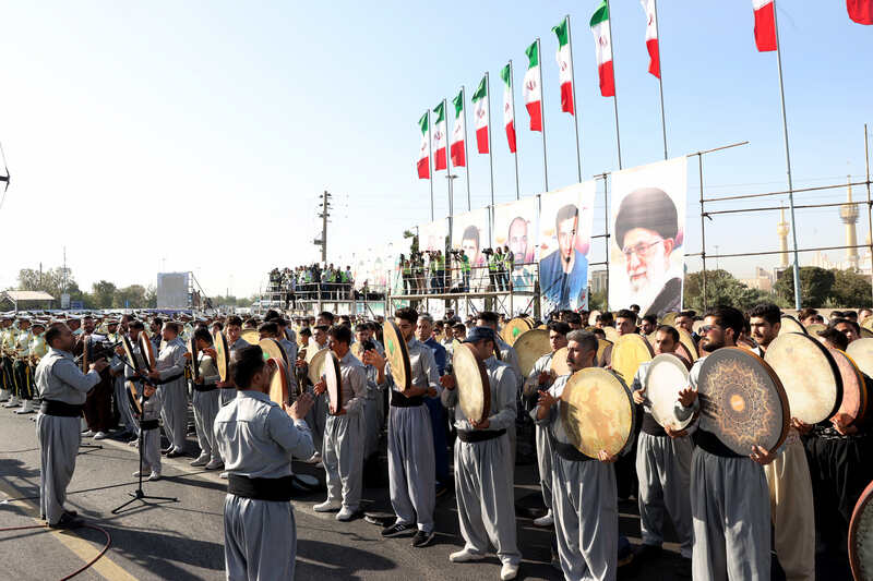 در عکسهای منتشرشده از مراسم امروز رژه نیروهای مسلح یک یک گروه دف نواز نیز دیده میشوند که مشغول دف نوازی در رژه نیروهای مسلح هستند.