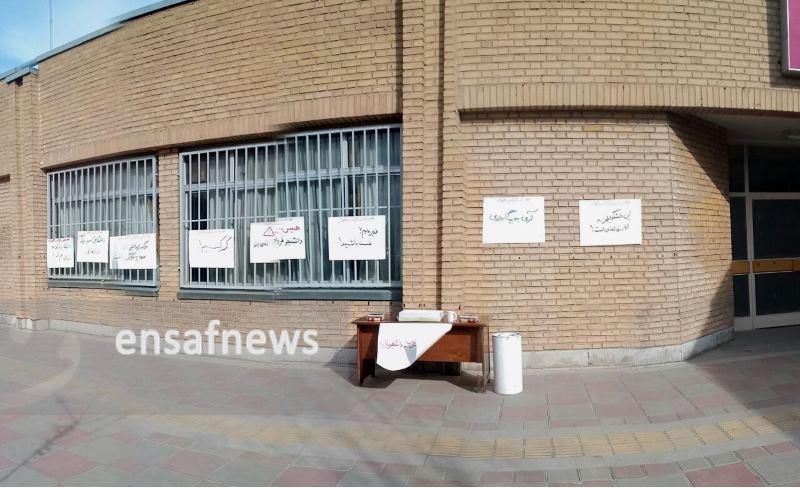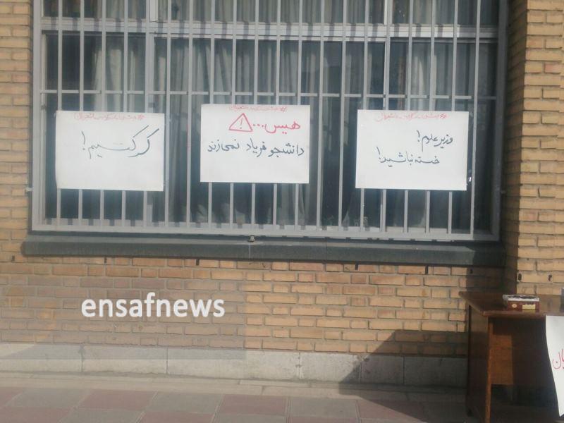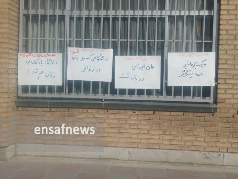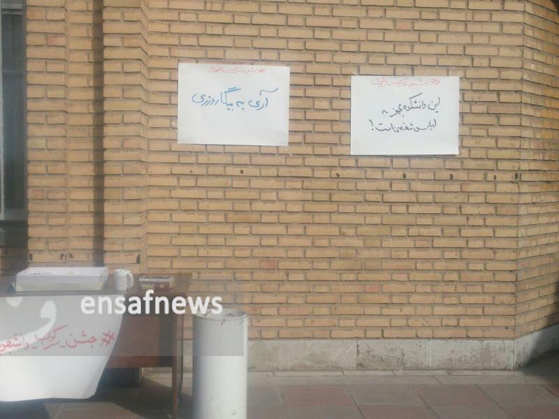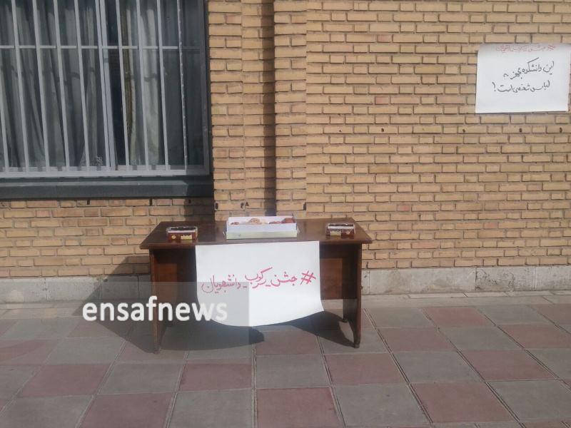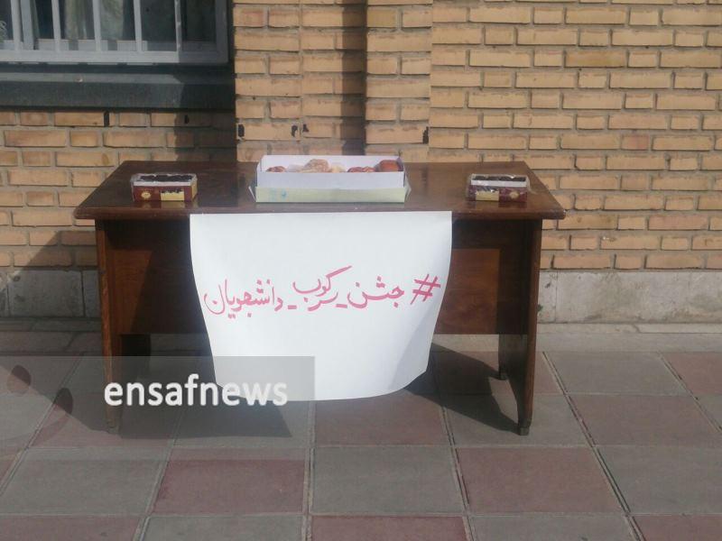 امروز دوشنبه در حرکتی دانشجویی در دانشکده‌ی علوم اجتماعی دانشگاه تهران، به نشانه‌ی اعتراض به بازداشت‌های اخیر تعدادی از دانشجویان، پلاکاردهایی دست نویس نصب شده بود و به کنایه در کنار آنها شیرینی، خرما و چای توزیع می‌شد! عکس‌ها: خبرنگار انصاف نیوز.