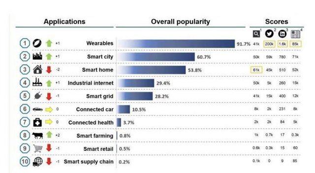 میزان محبوبیت برخی از کاربردهای اینترنت اشیا، که براساس جستجوی انجامشده در موتورهای جستجو، شبکههای اجتماعی و اخبار محاسبه شدهاند، در شکل زیر نشان داده شده است. همانطور که ملاحظه میشود، محبوبترین کاربردها به ترتیب عبارتند از: ابزارهای پوششی، شهر هوشمند، خانه هوشمند، اینترنت صنعتی، توزیع هوشمند برق، خودرو متصل، سلامت، کشاورزی و دامپروری، خرده فروشی، زنجیره تامین.