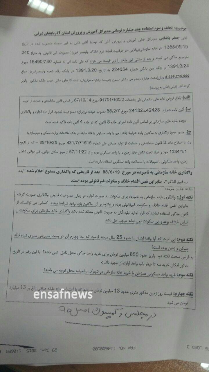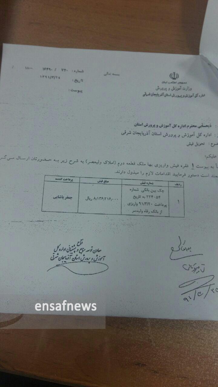 طبق اسناد ارسالی یکی از مخاطبان برای انصاف نیوز، مدیرکل آموزش و پرورش تبریز «جعفر پاشایی» که پیش از این در دورهی وزارت دکتر فانی نیز مدیرکل بوده است خانهای به متراژ 240 متر در خیابان ولیعصر را به قیمت 813 میلیون تومان در تاریخ خرداد 91 خریداری کرده است.