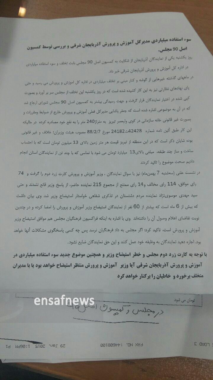 این مساله پیش از این در کمیسیون اصل 90 مجلس هم مورد بررسی قرار گرفته است. مخاطب انصاف نیوز مدعی است که چون یکی از معاونان این مدیر کل نسبت فامیلی نزدیک با مسوولین بازرسی تبریز دارد، بر مسالهی دریافت ملک نجومی مدیرکل سرپوش گذاشتهاند.
