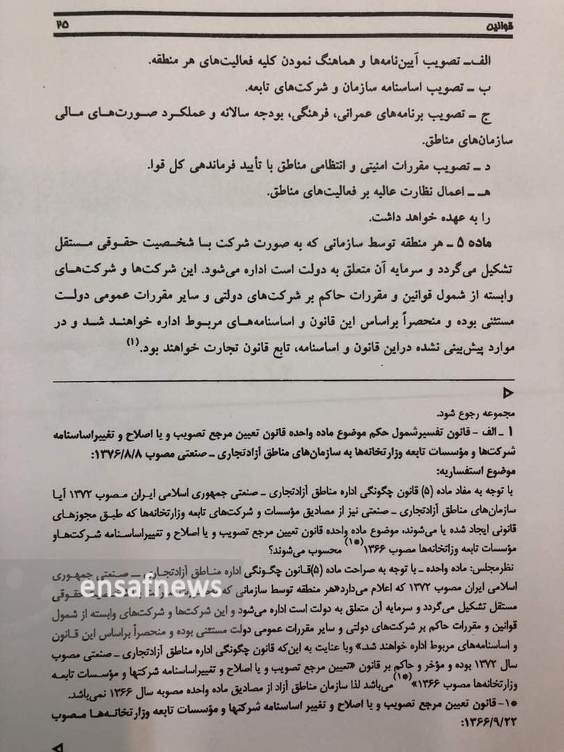 این درحالی است که در مقدمهی متن کامل قرارداد، به اختیارات قانونی ناشی از ماده قانون «چگونگی ادارهی مناطق آزاد تجاری-صنعتی» اشاره شده است. در این ماده قانونی آمده است: