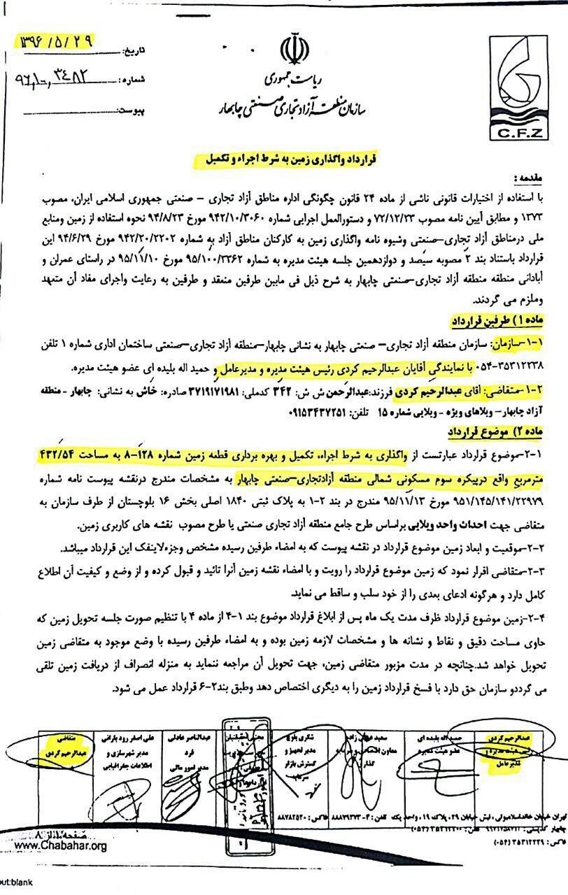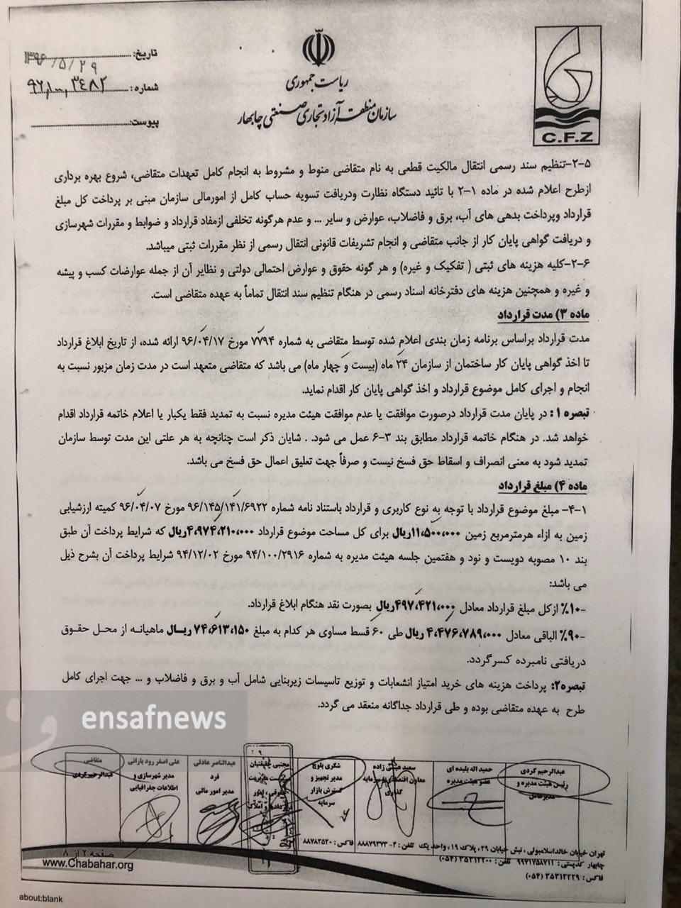 چندی پیش مخاطبی با ارسال خبری از یک کانال تلگرامی باعنوان «اصلاحات سیستان و بلوچستان» به نقل از کانال تلگرامی «ذره بین شرق» به انصاف نیوز مدعی شد تخلفاتی از قانون تجارت در گرفتن زمین توسط مدیر سازمان منطقه آزاد چابهار انجام شده است و ضمن نجومی دانستن آن، ادعا شده بود که قیمت زمین در قرارداد قید نشده است. طبق پیگیریهای خبرنگار انصاف نیوز و متن کامل قرارداد به دست آمده، علاوه بر اینکه قیمت زمین در قرارداد مربوطه ذکر شده است، در این قرارداد به اینکه قانون مناطق آزاد در برخی موارد تابع قانون تجارت نیست نیز اشاره شده است.
