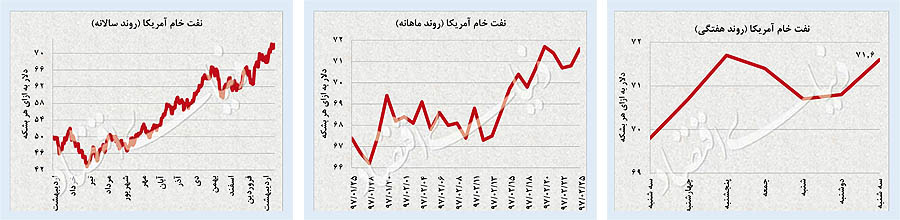 دیروز ساعت 16 هر بشکه نفت خام آمریکا به قیمت ۶/ ۷۱ دلار معامله شد. تشدید تنشهای خاورمیانه با تظاهرات نسبت به انتقال سفارت آمریکا به بیتالمقدس و کشته شدن دهها فلسطینی در کنار دیدار وزیر امور خارجه کشورمان با طرفهای انگلیسی، آلمانی و فرانسوی برنت را مجددا به سقف ۵/ ۳ ساله (به ۲۲/ ۷۹ دلار) رساند. موسسه جیپیمورگان با پیشبینی کاهش وارداتنفت از ایران از سوی ژاپن و کره جنوبی، کاهش ۵۰۰ هزار بشکه ای صادرات ایران با خروج آمریکا از برجام را پیشبینی کرد. اما به کاهش صادرات چین با توجه به قراردادهای بلندمدتتر و قابلیت معامله با یوآن، احتمال کمتری داد. با وجود پایبندی ۱۶۶ درصدیاوپک و رسیدن موجودی نفت تجاری ۹ میلیون بشکه بالاتر از میانگین ۵ساله، پیشبینیها از رشد تولیدات شیل به ۱۸/ ۷ میلیون بشکه در ژوئن فشار را بر نفت حفظ کرده است.